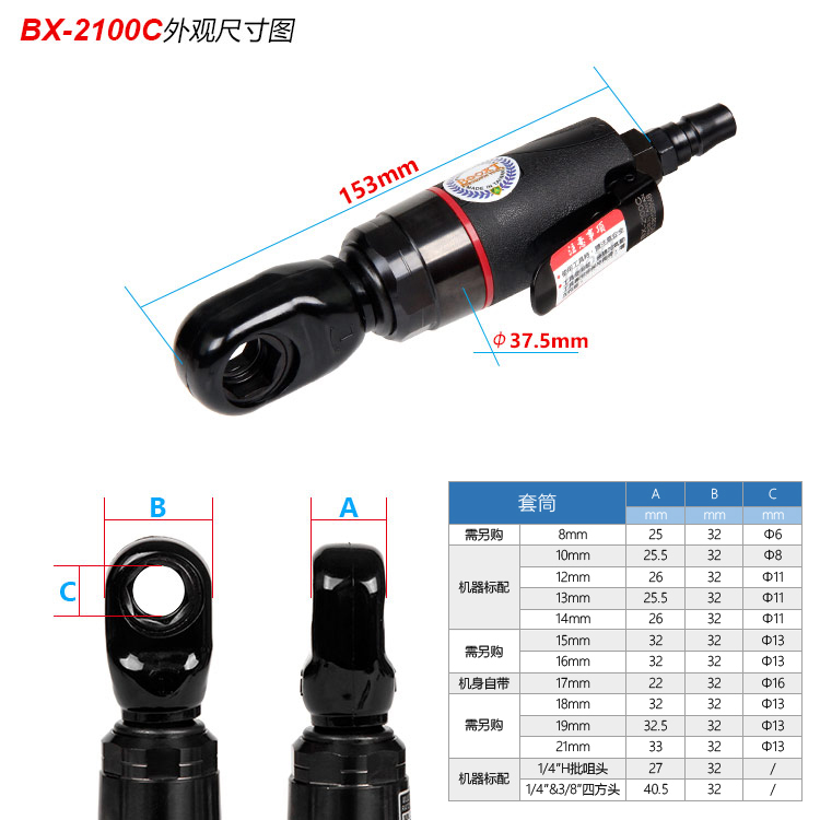 标配套筒:1/4H(可装风批头,当弯头风批使用),1/4"or3/8"两用头,M8,10,12,13,14 (原机M17)
