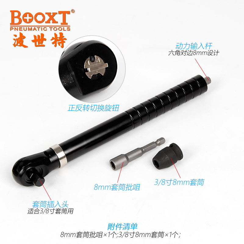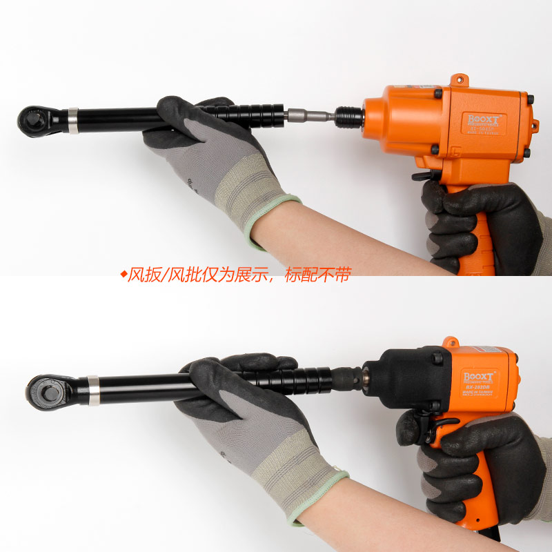 通过风批、风扳手、电批、电动扳手等转换成加长的棘轮扳手,适用于各行业深孔、狭窄位螺栓螺帽的拧紧或拆卸作业。