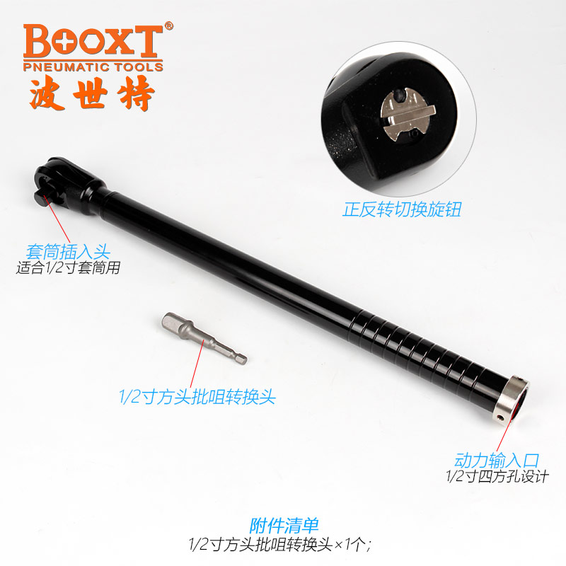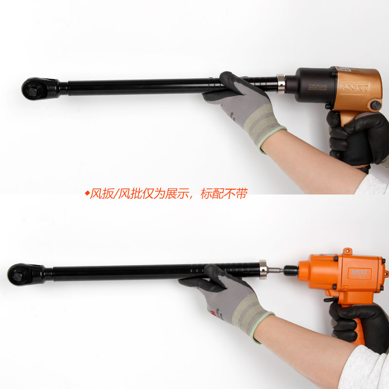 通过风批、风扳手、电批、电动扳手等转换成加长的棘轮扳手,适用于各行业深孔、狭窄位螺栓螺帽的拧紧或拆卸作业。