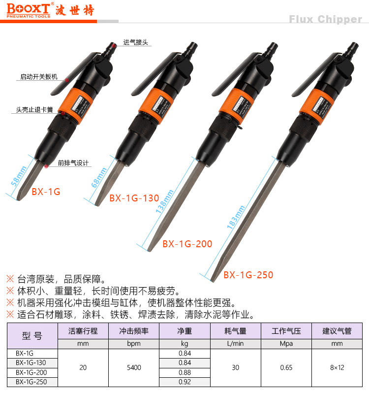 东莞市强劲五金工具提供台湾BOOXT波世特品牌,加长气动石材雕刻铲BX-1G-130厂家直销,首件享特价。咨询热线:4008301980