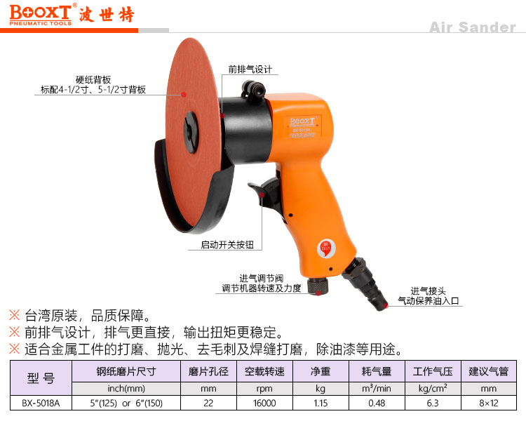 东莞市强劲五金工具有限公司提供台湾BOOXT波世特品牌气动工具,气动钢纸磨片打磨机BX-5018A厂家直销,首件享特价。咨询热线:4008301980