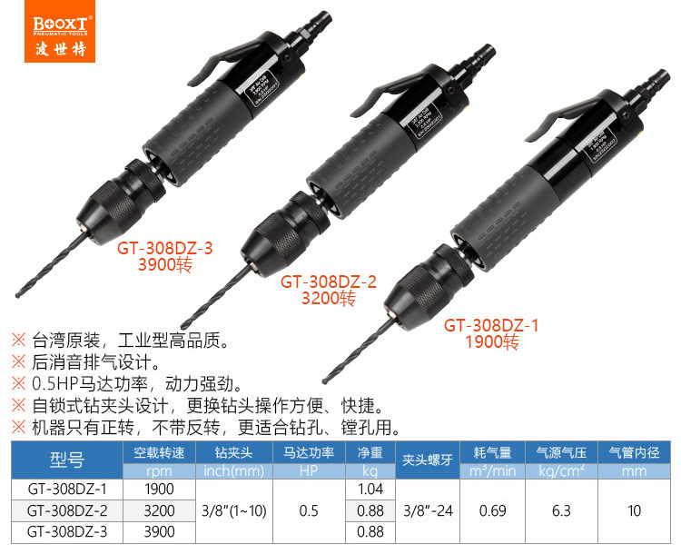 东莞市强劲五金工具有限公司提供台湾BOOXT波世特品牌气动工具,自锁夹头气钻GT-308DZ-1厂家直销,首件享特价。咨询热线:4008301980