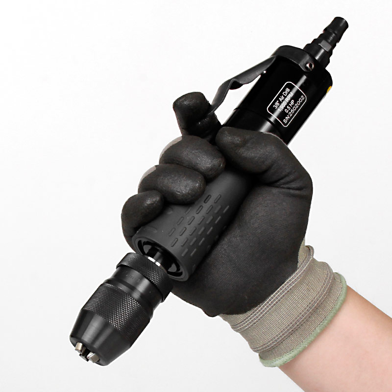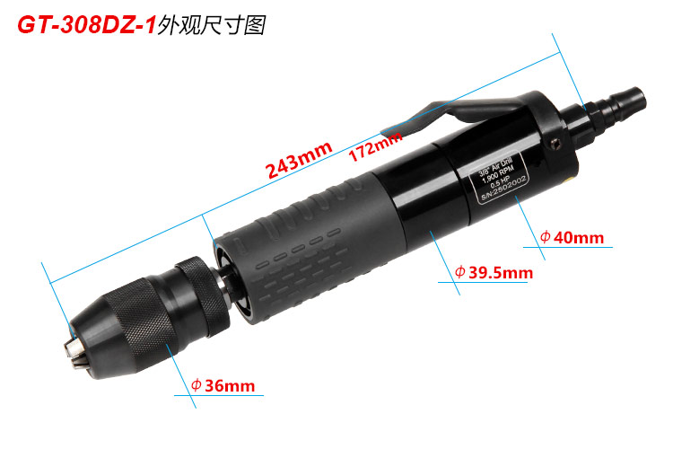• 产品参数: 夹头尺寸:3/8" 【1-10mm】 马达功率:0.5HP 空载转速:1900rpm 全 长:243mm 重 量:1.04kg 耗 气 量:0.69m3/min 【工业型】