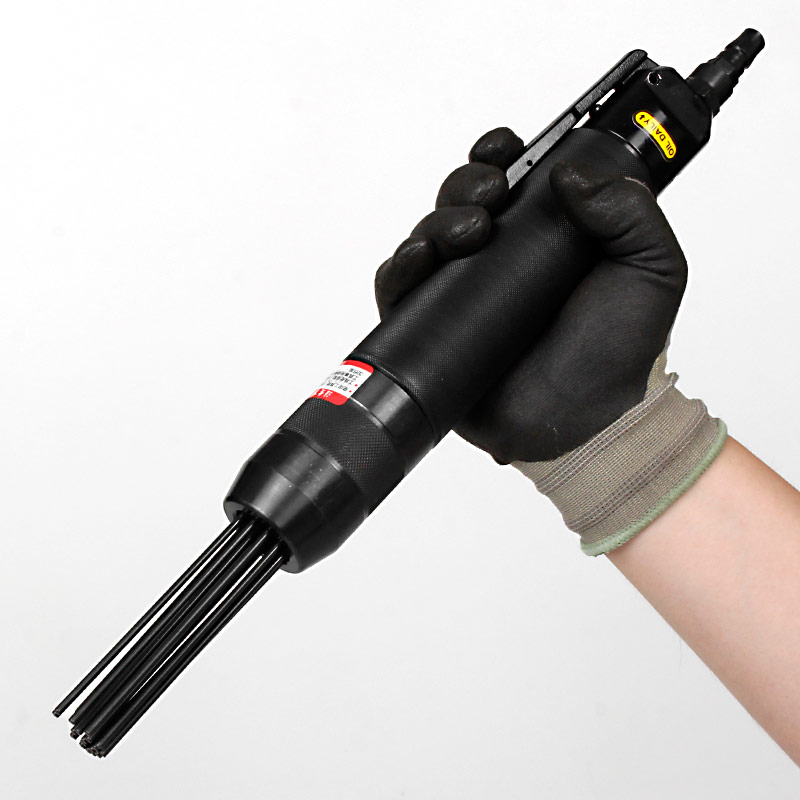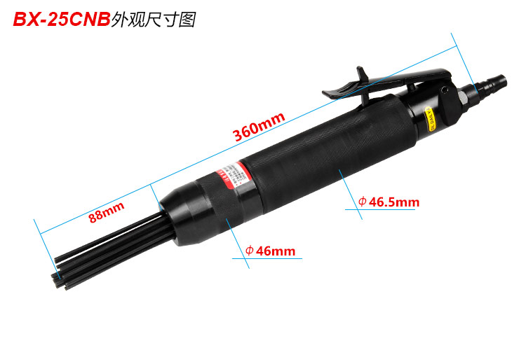 • 产品参数: 冲击频率:4700bpm 活塞尺寸:22*88mm 活塞行程:23mm 除锈针数量:19pcs 除锈针尺寸:M3*180L 耗 气 量:0.28m3/min 全 长:360mm 净 重:1.7kg 噪 音 值:104db(A) 【工业级/减震型】