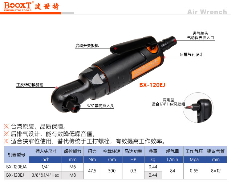 东莞市强劲五金工具有限公司提供台湾BOOXT波世特品牌气动工具,两用气动棘轮扳手BX-120EJ厂家直销,首件享特价。咨询热线:4008301980