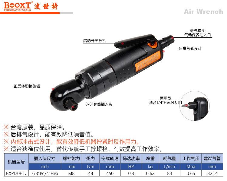 东莞市强劲五金工具有限公司提供台湾BOOXT波世特品牌气动工具,两用气动棘轮扳手BX-120EJD厂家直销,首件享特价。咨询热线:4008301980