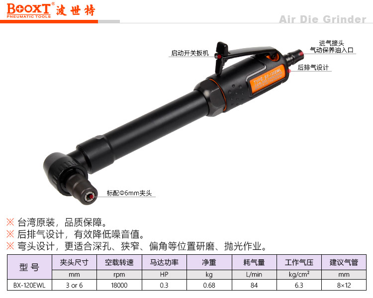 东莞市强劲五金工具有限公司提供台湾BOOXT波世特品牌气动工具,加长弯头气动打磨机BX-120EWL厂家直销,首件享特价。咨询热线:4008301980
