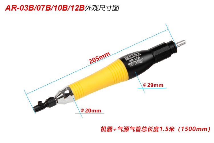• 产品参数: 夹头直径:3mm 前后行程:1.2mm 行程转数:25000bpm 外形尺寸:29*205mm 耗 气 量:0.21m3/min 重 量:0.28kg 【经济型】